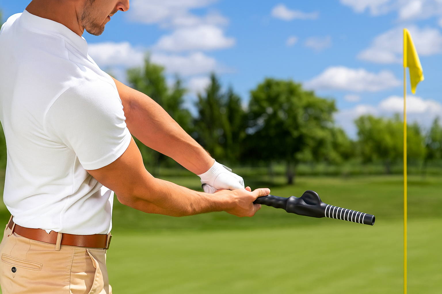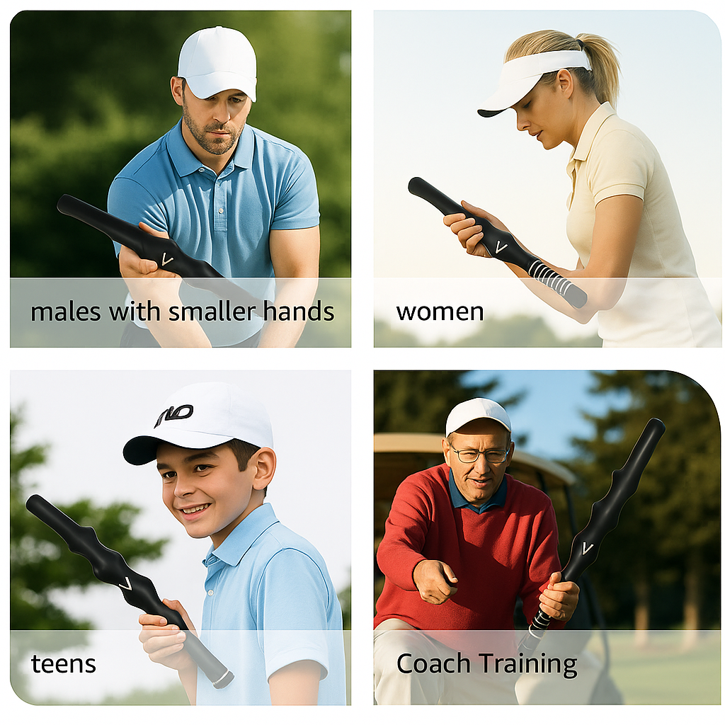 The Golf Swing Trainer helps golfers develop proper hand placement and grip technique to improve control, power, and accuracy during their swing.